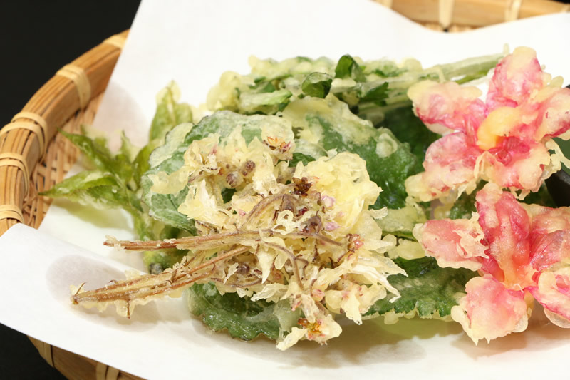 旦那が摘んでくる、四季折々の山野草を使用した摘み草料理。 春にはよもぎ、うど、たらの芽・・・など、その季節に採れる天然の山野草を天ぷらなどでお召し上がりいただきます。 わいた温泉郷ならではの自然や旬の食材を利用した田舎料理で、自然のものを堪能する贅沢、自然のエネルギーを頂ける喜びをご堪能ください。 ※季節により料理内容は異なります。