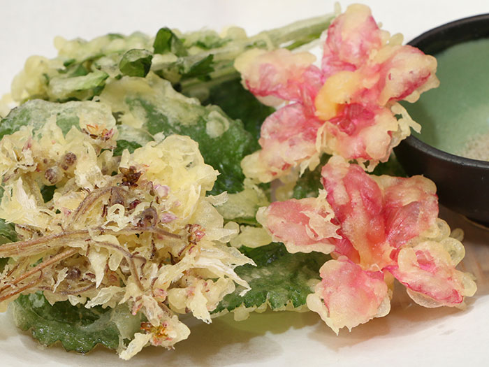 春にはよもぎ、うど、たらの芽・・・など、その季節に採れる天然の山野草を天ぷらなどでお召し上がりいただきます。